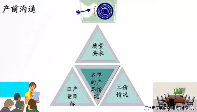 3、员工开早会总结前一天的实际产量,针对问题做出汇总,对表现积极的员工予以表扬,不可以批评出错的员工。批评应该以私下劝导的方式。