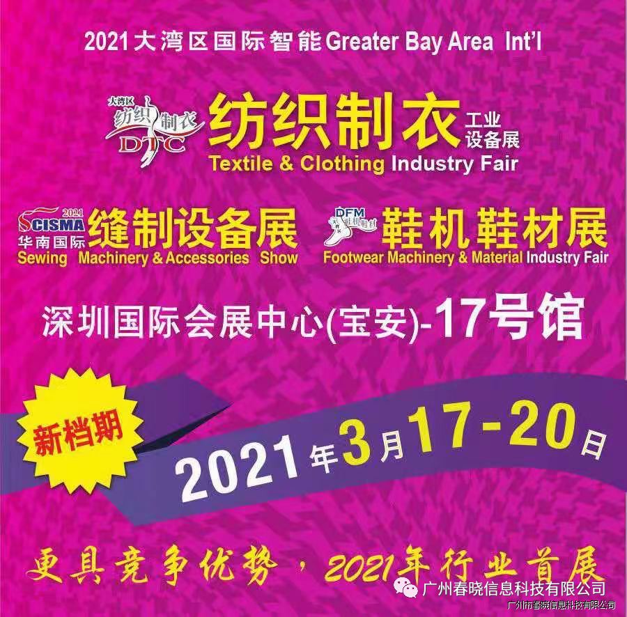 欢迎参观2021大湾区国际智能纺织制衣工业设备展DTC、华南国际缝制设备展SCISMA??U8国际将于3月17-20日在深圳国际会展中心(宝安新馆)举行,展览规模5万平方米,逾450家知名企业同台亮相,向业界展现当今世界纺织制衣制鞋最新智能技术及设备,响应国家双循环号召,与大家共同迎接市场复苏旺季。