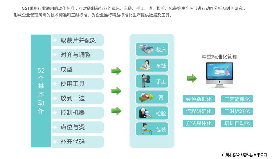 昊天制衣通过引进春晓GST标准化管理系统,实现工时标准化、优化生产工艺流程、实现管理精细化,为业务发展提供更加有力的支撑,发挥业务板块与实业板块之间的桥梁纽带作用。绿色生产,公司把传统产业优势和转型升级结合起来,对客户每一项新需求,新概念,新想法快速作出反应。通过GST标准,将全面管理公司的各种工艺技术标准,以及建立完善的标准工时核算和应用体系,进一步通过对技术人员(IE人员)、管理人员的GST分析培训,逐步深入标准化的应用,推进标准化,自动化,可视化,信息化改善,充分发挥信息技术在生产过程中的作用。