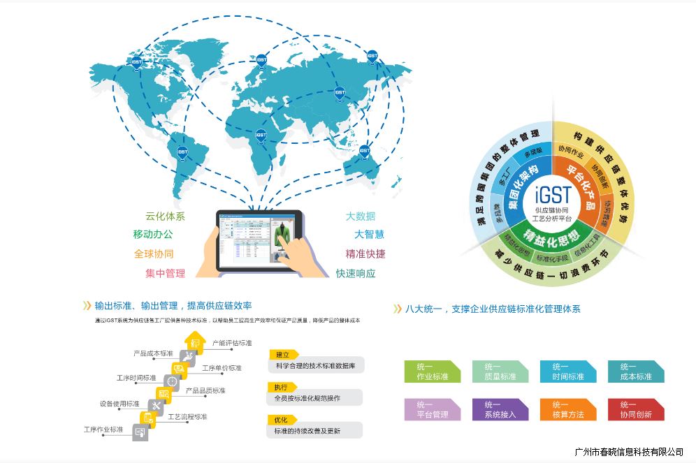 通过春晓iGST标准化协同管理平台,特步供应链管理部门协调内部外部信息,让供应链的每一个参与者都能清晰了解并掌握生产工艺、品质要求、工艺流程、作业方法、作业时间、作业成本、生产计划、订单负荷、人机需求等标准化数据、从而达到统一标准、统一规范化的管理。